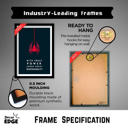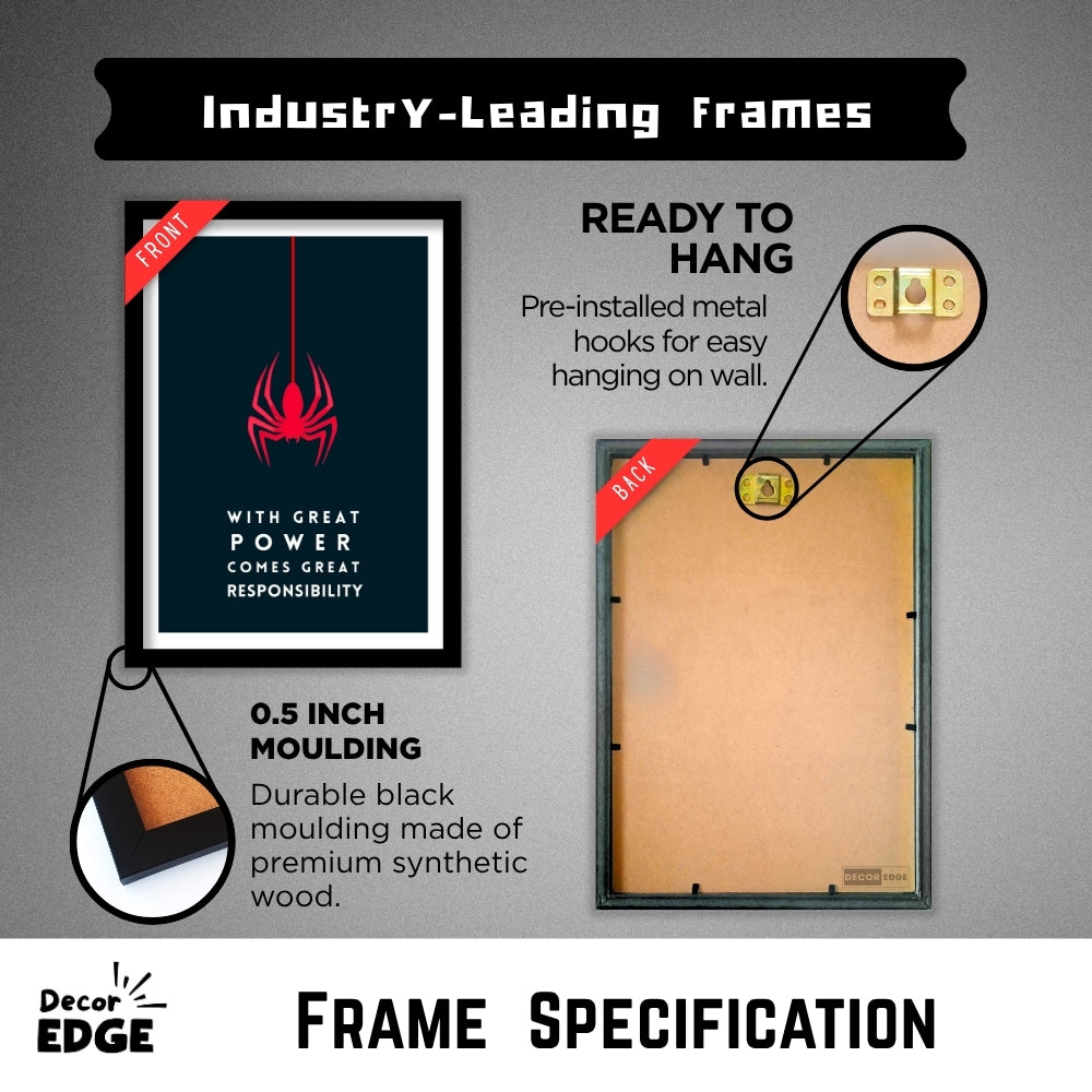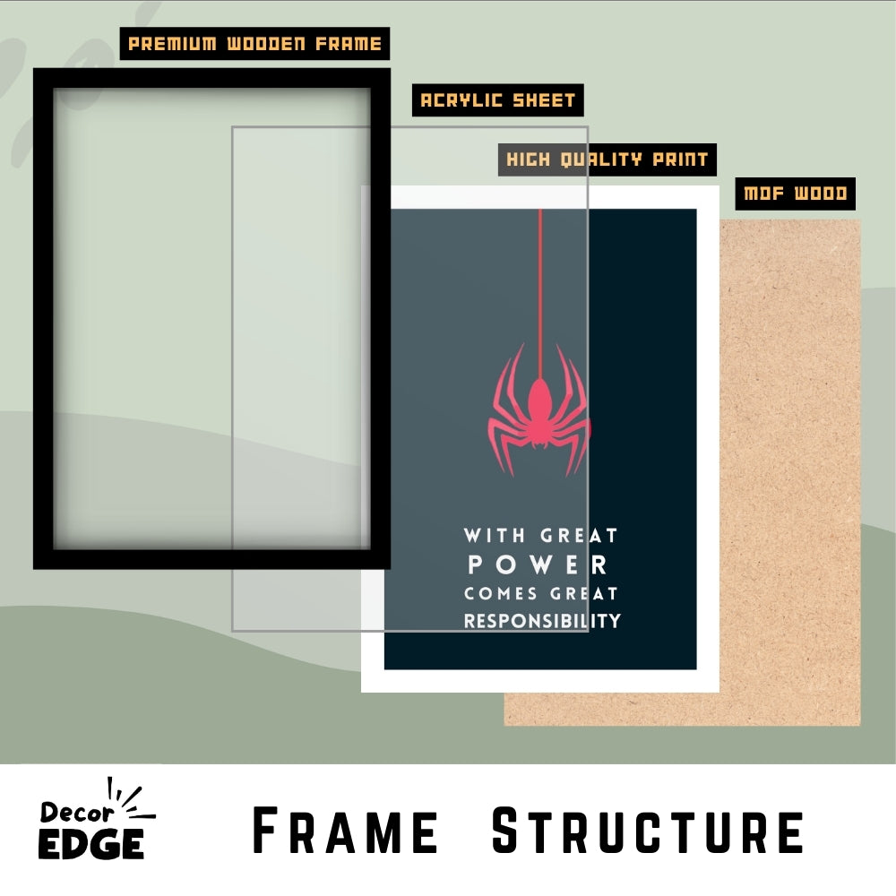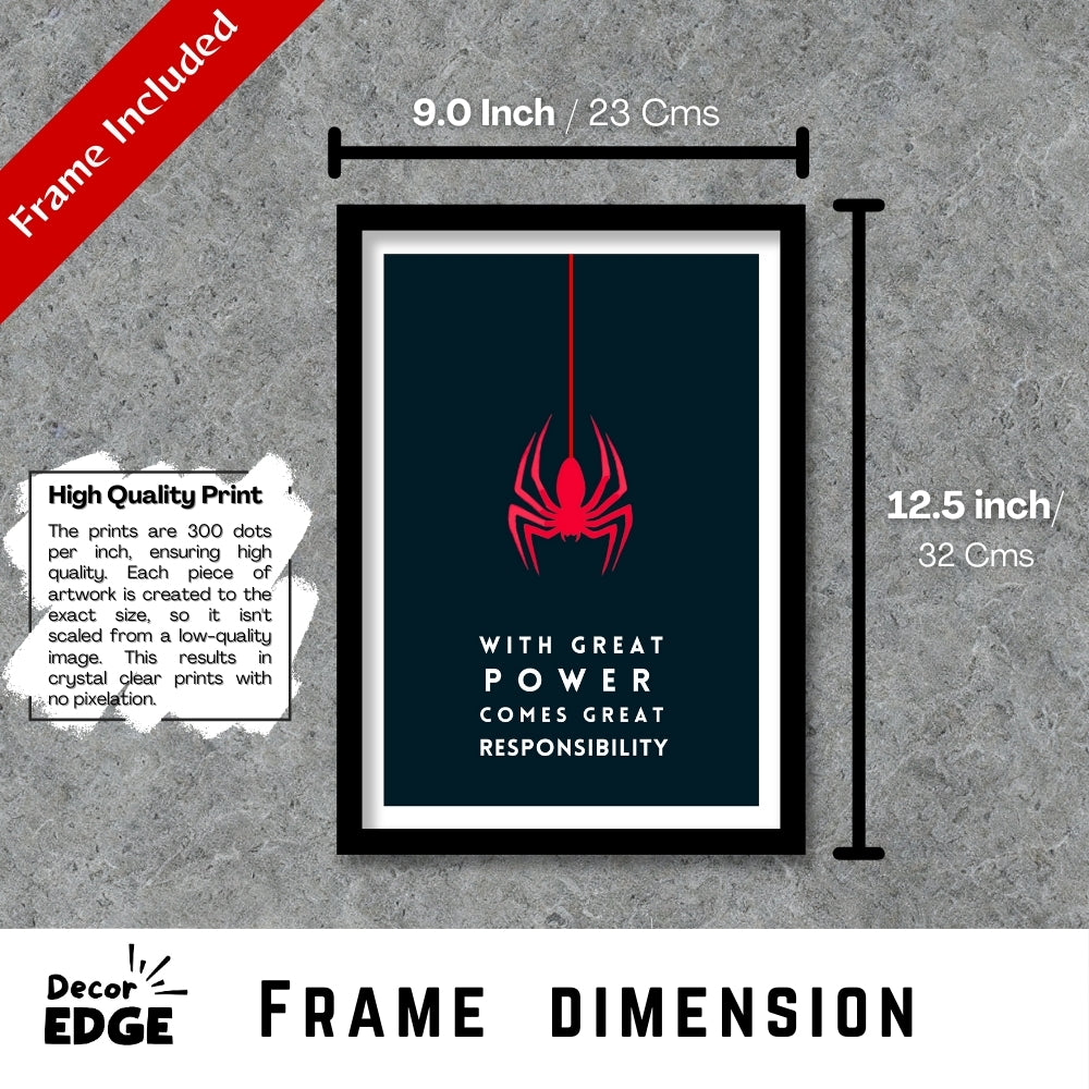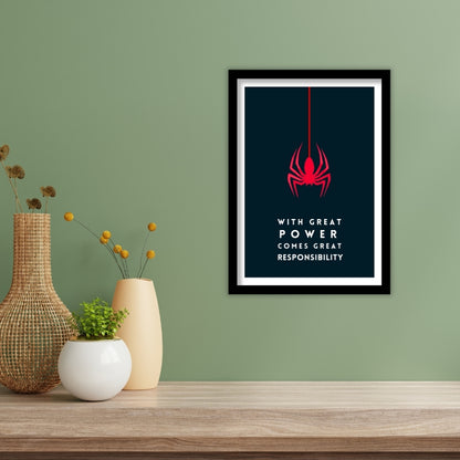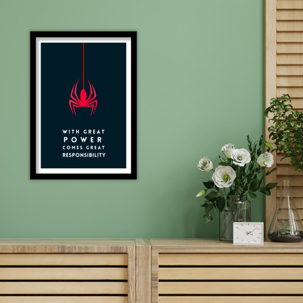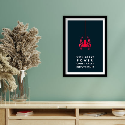 Elevate your space with this striking minimalist poster, featuring the iconic red spider symbol and the legendary quote, "With great power comes great responsibility." Perfect for superhero fans and those who appreciate bold, motivational art. Framed in a premium matte-finished artificial wood, this piece is ready to enhance your decor with a touch of heroism.