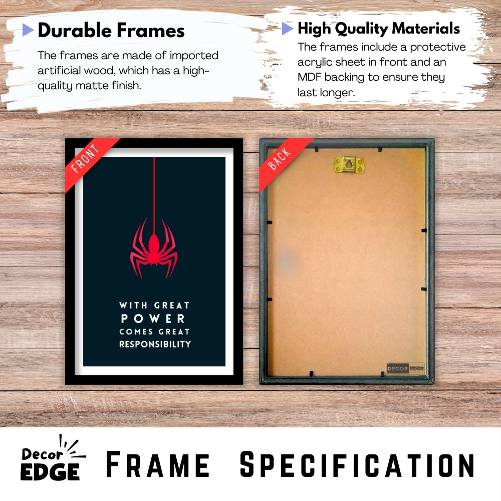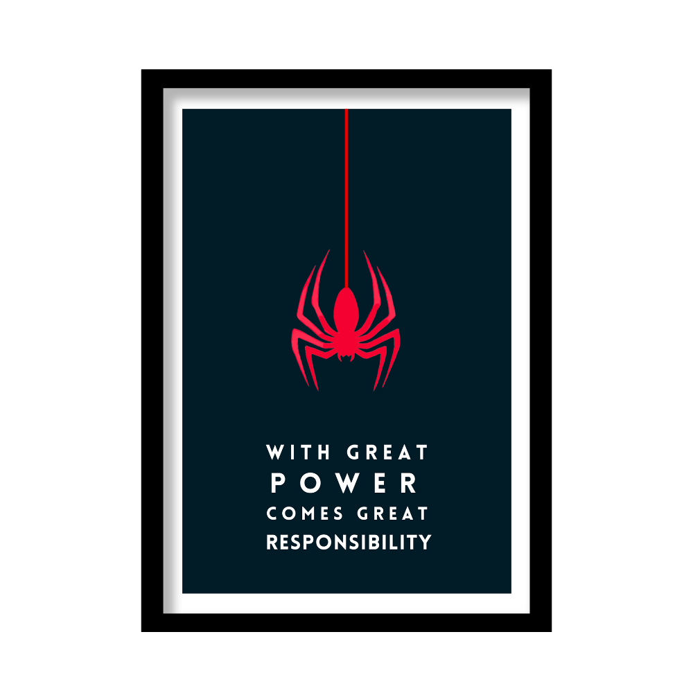 Elevate your space with this striking minimalist poster, featuring the iconic red spider symbol and the legendary quote, "With great power comes great responsibility." Perfect for superhero fans and those who appreciate bold, motivational art. Framed in a premium matte-finished artificial wood, this piece is ready to enhance your decor with a touch of heroism.